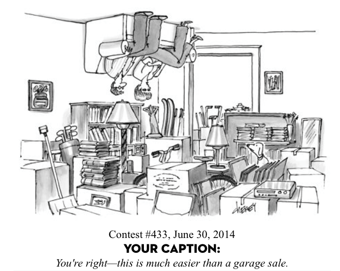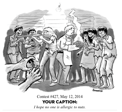 The New Yorker magazine has a weekly caption contest in which readers can suggest captions for cartoons. Inspired by my friend Jamie I've taken to entering from time to time - here's this week's entry.